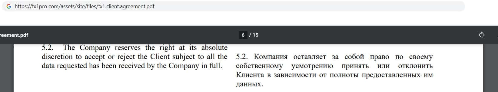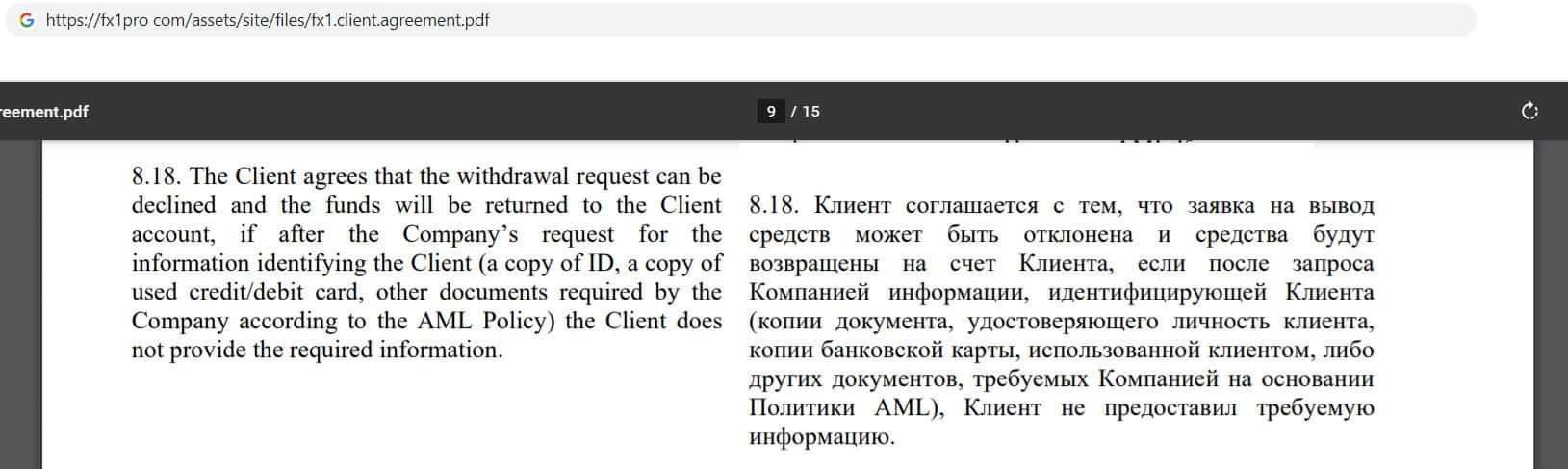 В данном пункте соглашения, фирма аферистов FX1Pro указала, что может отклонить заявку на вывод средств, если клиент не предоставит мошенникам практически все личные данные.