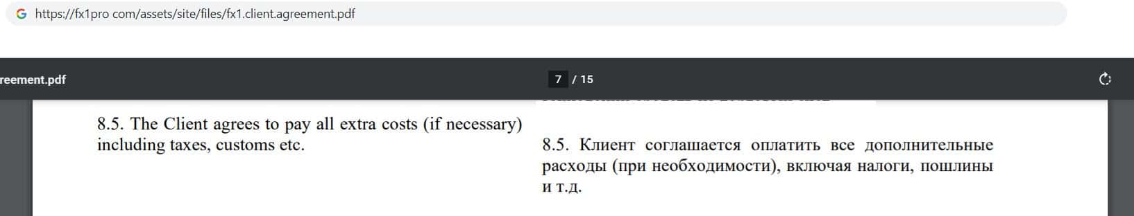 Так же фирма финансовых жуликов ФХ 1 Про указала, что клиент должен оплачивать все налоги и дополнительные сборы, которые придумывает сама фирма махинаторов.