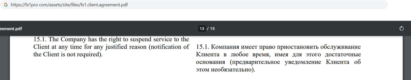 А вот в данном пункт, компания лохотронщиков FX1Pro указала, что может прекратить сотрудничество с клиентом в любое время без предварительного предупреждения.
