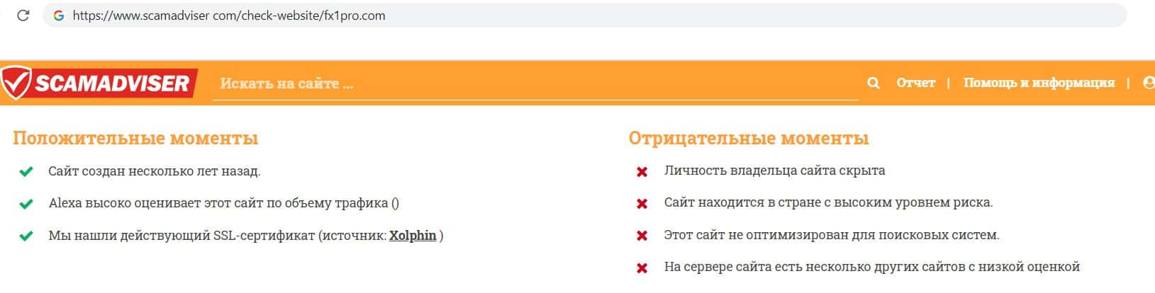- Мнение интернет ресурса scamadviser com о конторе махинаторов ФХ 1 Про