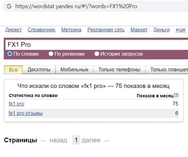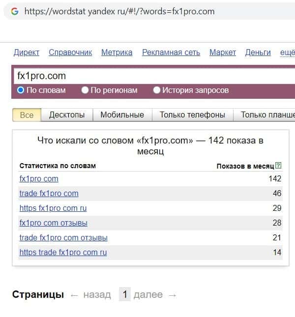 Мы так же решили проверить количество запросов компании аферистов FX1Pro по русскоязычному названию компании, а именно "ФХ 1 Про". Но данный запрос никто не выполнял.