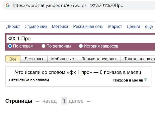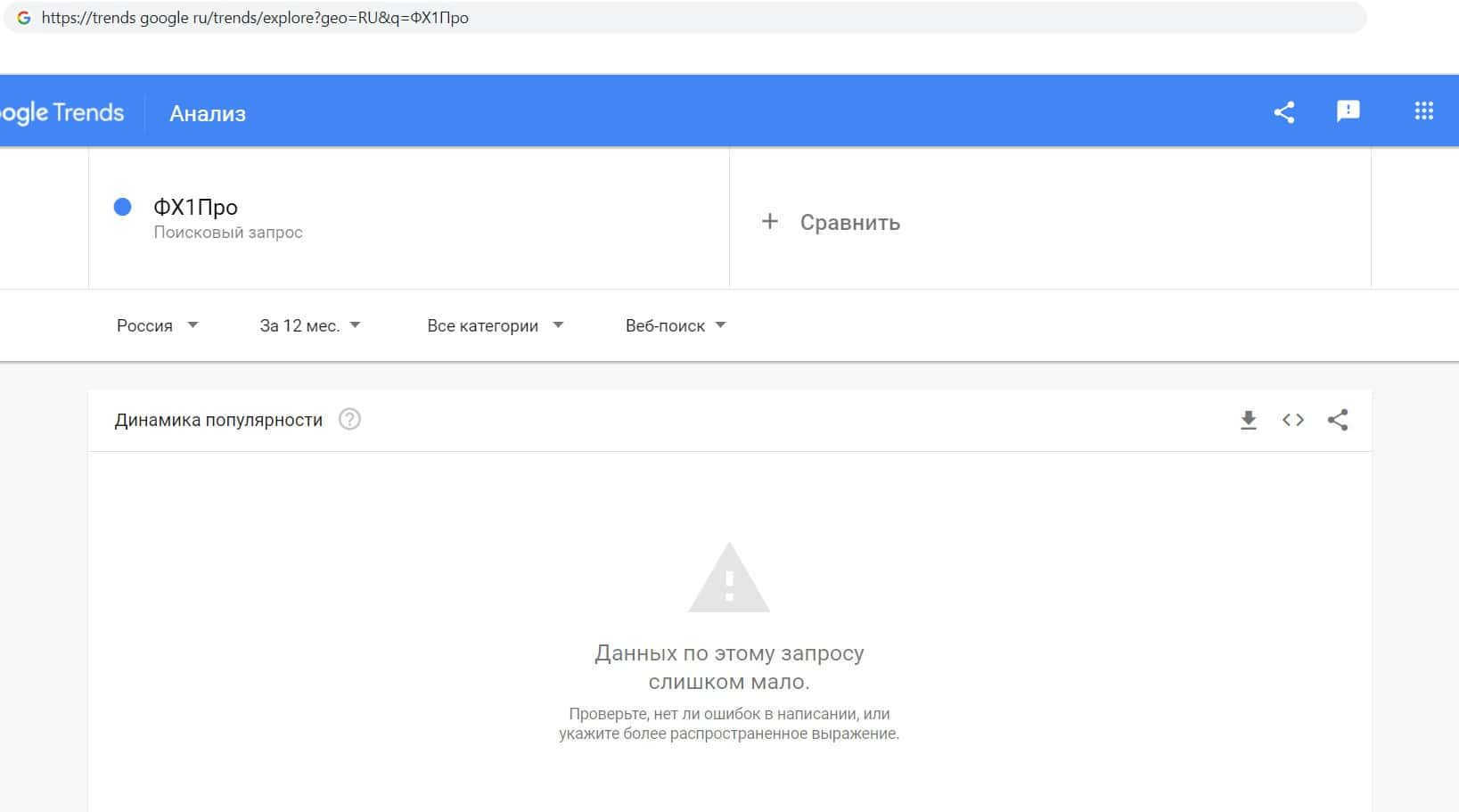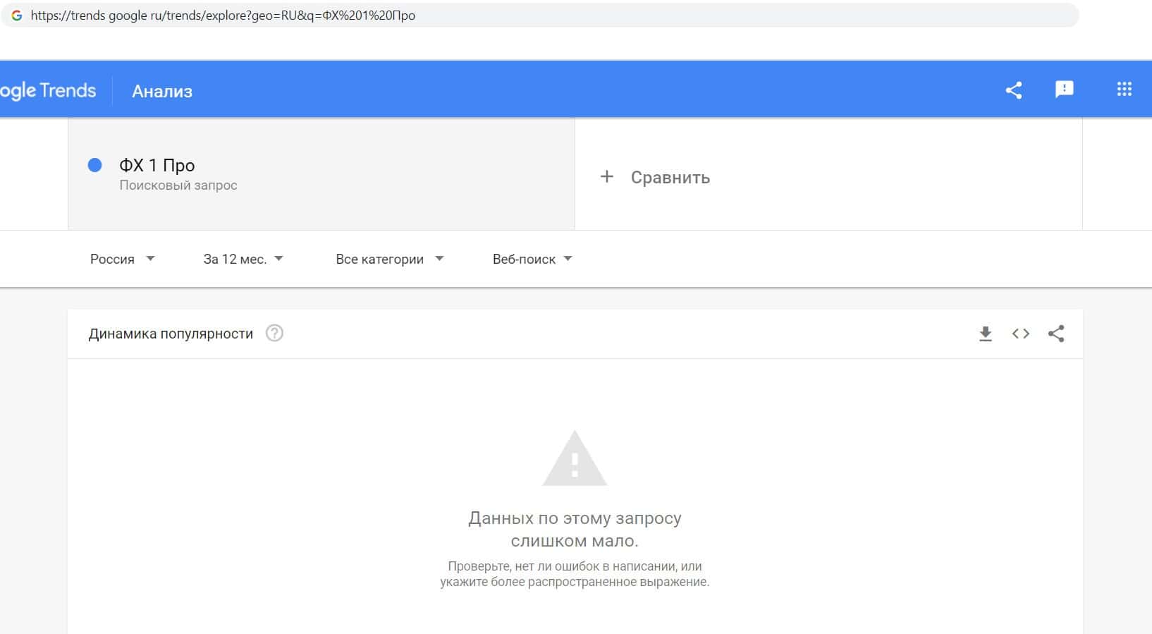 Ещё мы решили проверить количество запросов фирмы разводил ФХ 1 Про по русскоязычному названию, но без пробелов, а именно "ФХ1Про". Но результат снова - нулевой.