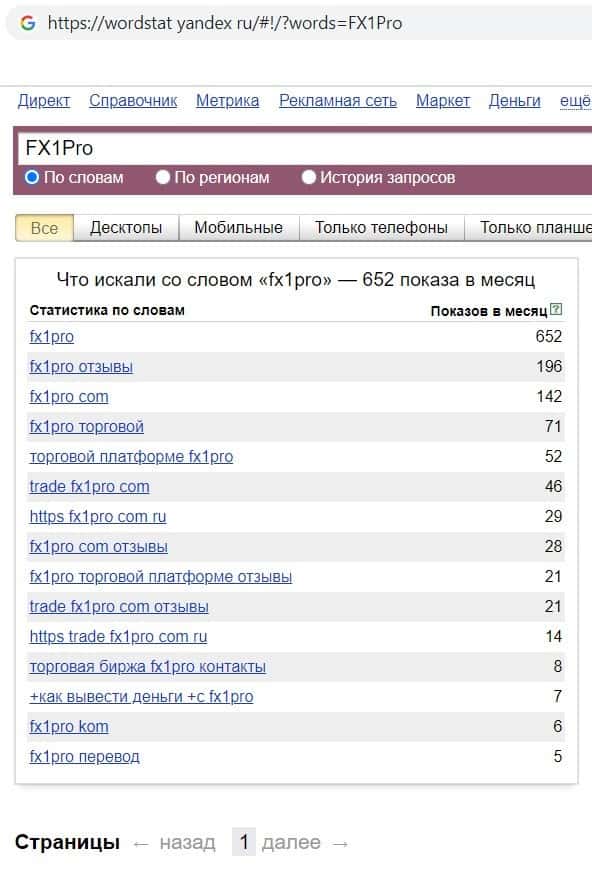 Мы проверили количество запросов компании мошенников FX1Pro в Яндексе по названию конторы, а именно "FX1Pro". 652 раза пользователи совершили данный запрос в Яндексе.