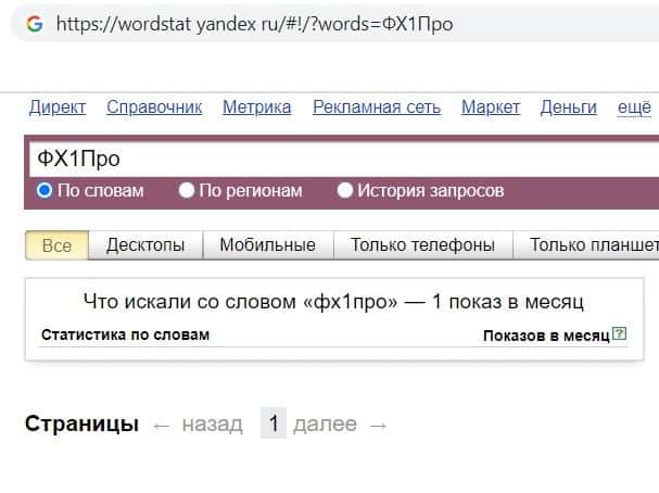 Ещё мы проверили количество запросов фирмы жуликов ФХ 1 Про по русскоязычному названию, но без пробелов, а именно "ФХ1Про". Всего 1 раз пользователь выполнили этот запрос.