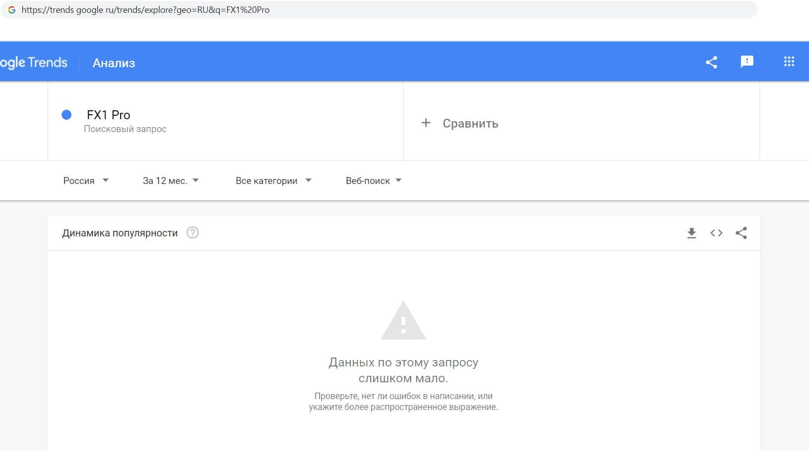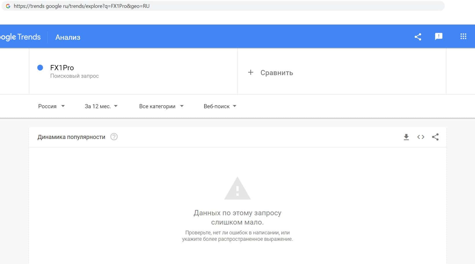 Мы решили проверить количество запросов компании жуликов FX1Pro в Google по названию фирмы, а именно "FX1Pro". Но данный запрос пользователи не выполняли в течении года.