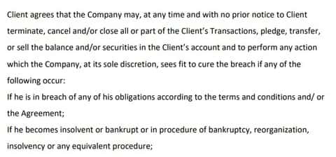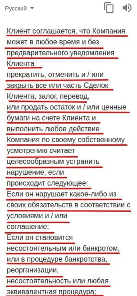 Как и с политикой конфиденциальности, русских пользователей обделили и знанием того, на что они соглашаются в условиях и положениях компании FXBreeze. Но мы прольем немного света на правду. В соглашении конторы ФХБриз сказано, что при определенных условиях мошенник FXBreeze сможет заблокировать или вернуть ваш аккаунт, и вы не можете ничего предпринять или утверждать против компании. Короче говоря, деньги которые вы "вложили" вы вряд ли увидите в будущем.