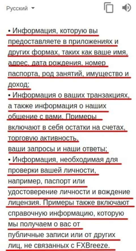 Ниже представлен перевод условий сбора личной информации ФХ Бриз.Условия и положения аферистов ФХ Бриз