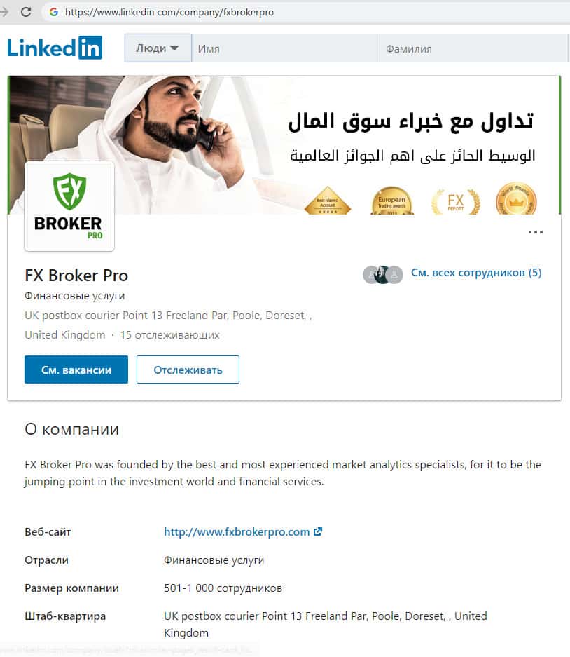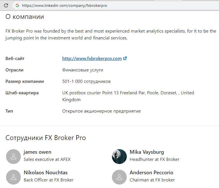 Сохранилась небольшая страничка мошенников из Фх Брокер Про, открытая ими в социальной сети linkedin. Из информации, представленной на этой странице можно узнать, что компания ФХ Брокер Про являлась открытым акционерным обществом со штаб-квартирой по адресу Point 13 Freeland Par, Poole, Doreset, United Kingdom.