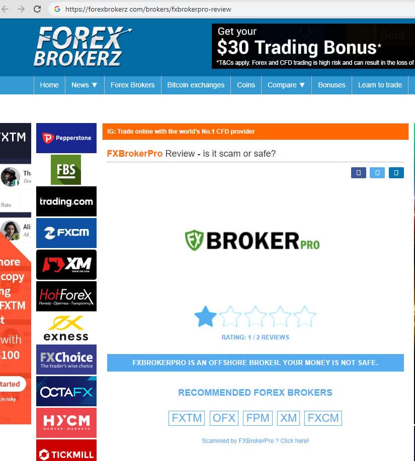 Этот обзор, размещенный на портале forexbrokerz com, является последним следом деятельности и фактом существования ещё недавно существовавшего брокерского портала ФХ Брокер Про. В статье приводится обзор типов аккаунтов, предлагаемых брокером, и обзор других условий трейдинга на брокерской площадке ФХ Брокер Про. Вердикт статьи: ФХ Брокер Про - афера!!!