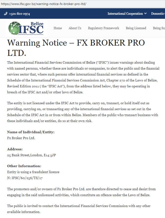 - Предупреждение IFSC Белиза о мошеннической деятельности FxBroker Pro