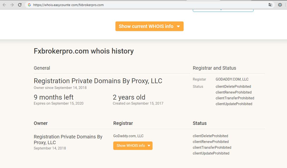 История доменного имени fxbrokerpro com начинается с его регистрации 14 сентября 2018 года, и до истечения срока его регистрации осталось ещё девять месяцев. Однако сайт был преждевременно закрыт, а его контент был удален 7 октября 2019 года. На этом заканчивается история ещё одного жульнического проекта, но может продолжиться под другим именем.