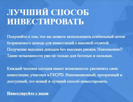 Продвигаясь далее по порталу FXCPD Com, можно попасть на раздел, где описываются все основные моменты безрискового инвестирования, участвуя в FXCPD. Ворюги уверяют несчастных пользователей в том, что эта платформа инновационная, прозрачная и доступная, это новый и лучший способ инвестировать. А, по факту, сплошное кидалово на бабки.