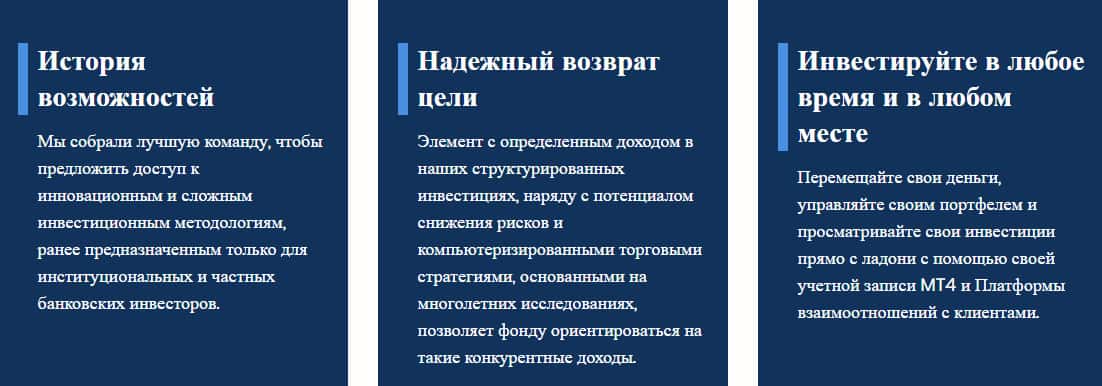 Далее на странице лживой компании FXCPD Com описываются преимущества, которые получит потенциальный клиент от работы с жуликами из данной конторы. Ворюги пытаются привлечь инвесторов такими опциями, как надежный возврат цели, огромные возможности и инвестирование в любом месте и в любое время. Но это лишь пустые обещания.