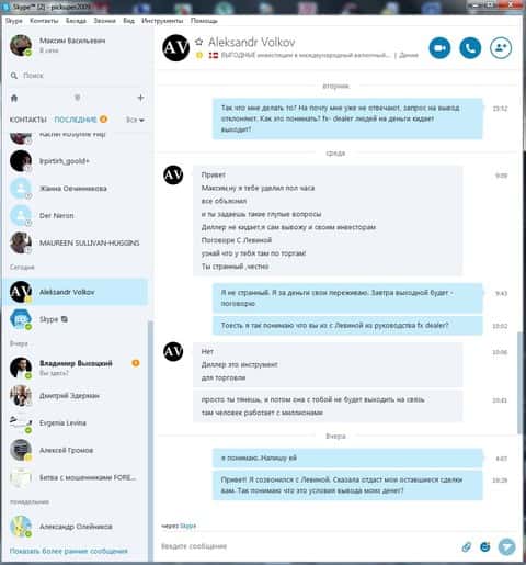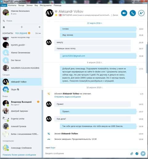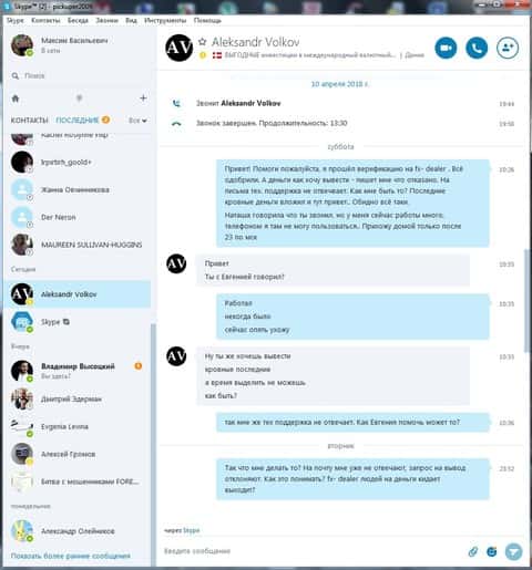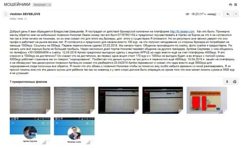 Несмотря на предостережение о брокер-мошенниках, люди продолжают попадаться на уловки аферистов и терять деньги. Никто не хочет искать информацию и разбираться, проще отдать деньги, а потом начинать думать. Так сделал и очередной клиент ФХ Дилер, который повелся на удочку мошенников, а именно звонаря кухни Елены Романовой, и отдал сумму 500 долларов. Каждый день его уговаривал аналитик брокерской кухни FX-DEALER Евгений Левин и лестью, и угрозами пополнить счет еще на 3000 долларов. После того как клиент отказался от всех предложений, им занялся старший аналитик по разводу жертв Владислав Мадсен. Он сделал свое дело и слил все деньги. Так клиент потерял свои вложенные средства, а кухня осталась безнаказанной.