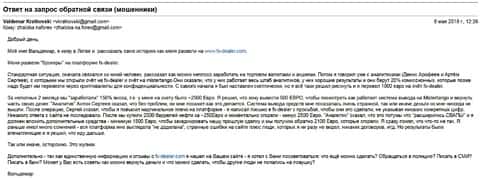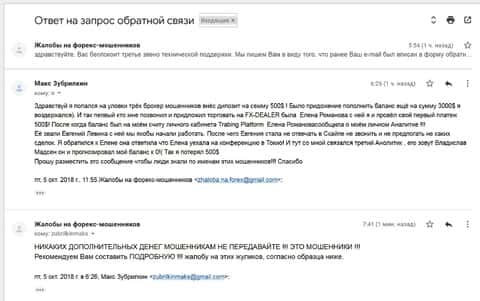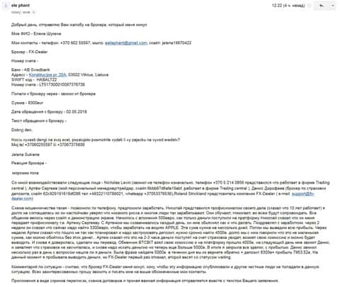 Про мошенников FX-DEALER стало известно от ЕЩЕ ОДНОГО обманутого клиента мошенниками. На этот раз, мошенники обманули несчастного доверчивого человека на 5000 евро, само письмо демонстрируем ниже.