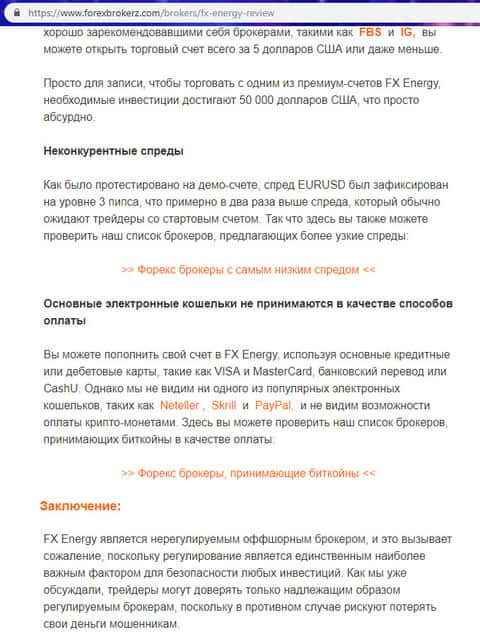 Множество ресурсов написало о негативной деятельности мошенников FX EnergyTrade. Одним из таких стала веб-площадка forexbrokerz com, которая описала все явные и неявные недостатки жуликов ФХ Энерджи Трейд, в перечень которых вошли их не конкурентоспособные торговые возможности и отсутствие поддержки наиболее популярных и безопасных систем проведения электронных платежей. В явные же недостатки ресурс форексброкерз ком отнес отсутствие лицензии и регулирования аферистов FX EnergyTrade. Заключение ресурса forexbrokerz com по отношения к лохотрону ФХ Энерджи Трейд вы можете увидеть на изображении ниже.
