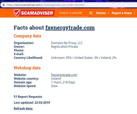 Об подлинных контактах руководителей шулеров FX EnergyTrade ничего не известно, так как мошенники на всех уровнях скрывают свою личность, дабы не нести ответственность за свою противозаконную деятельность. Одним из таких способов сокрытия информации стал анонимный сервис, который мошенники ФХ Энерджи Трейд начали использовать с целью сокрытия реального местоположения сервера своего подвального сайта. Так же, благодаря ресурсу scamadviser com мы можем узнать, что деятельности шулеров FX EnergyTrade всего меньше двух лет, что явно не делает аферистов надежным брокером. Эту и дополнительную информацию о лохотроне ФХ Энерджи Трейд с сайта скамадвайзер ком вы можете увидеть на изображении ниже.