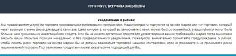 Здесь же можно найти предупреждение о "возможных" рисках. Точно, для трейдеров, связавшихся с фальшивыми брокерами FxFly, они значительно возрастают. Кстати, по сайту уведомление о рисках встречается дважды - умный ход. Как и "правильно" прописанное соглашение, он позволяет мошенником легко "отбиваться" от претензий.