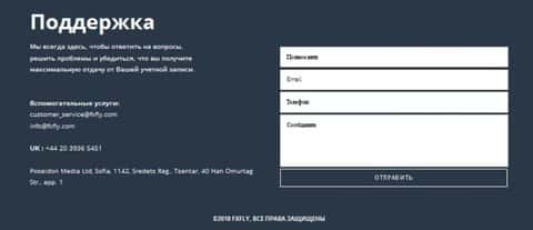 Естественно, на страничке фальшивых брокеров FxFly есть контактные данные - иначе кто бы им поверил. Даже форму обратной связи впихнули. Вот только при внимательном рассмотрении эти данные вызывают, мягко говоря, подозрения: