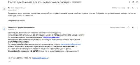 Контора ФХ Коин создает идеальные условия для того, чтобы клиент внес деньги на их площадку. Все идет хорошо до того момента, пока инвестор не пытается вывести деньги. После этого сотрудничество переходит на новый уровень – с него начинают требовать гораздо большую сумму за вывод и данные банковской карты. Автор жалобы на адрес ChargeBack.Me имел дело с такими жуликами: