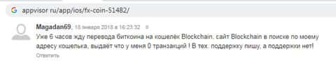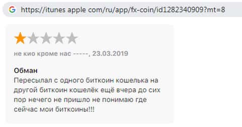 Жертва, скачавшая мошенническое приложение от FX Coin, коим является якобы биткоин-кошелек по обмену реальных денег на биткоины, пишет, что получить купленные биткоины ей не удалось. Понятно, что скам-приложение разработано лишь на получение средств от наивных лохов, и уж никак не рассчитано на вывод финансов.