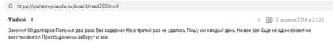 Аферисты из ФХ Коин используют различные хитрые способы, чтобы привлечь внимание доверчивых вкладчиков. Выгодное на первый взгляд предложение конторы лишило этого клиента 90 $. Позволив вкладчику вывести 2 раза средства, мошенники добились, чтобы он закинул на их площадку большую сумму, и смылись с его деньгами.