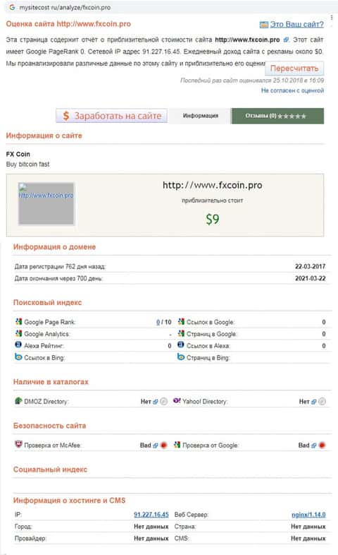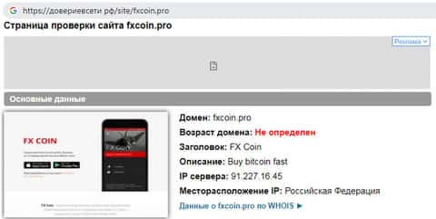 Поиск информации по домену ФХ Коин на довериевсети рф показывает, что расположена шарага в РФ. Возраст домена не определен, что уже попахивает попыткой владельца скам-проекта скрыть настоящую информацию от вкладчиков. Это явно не прибавляет доверия к этой и без того подозрительной программе.