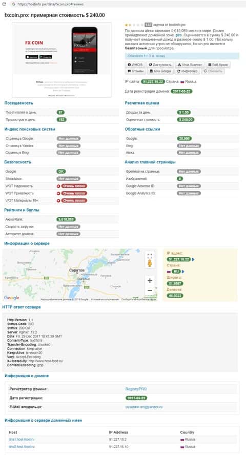 Данные же по домену ФХ Коин с другого источника явно указывают, что по IP-адресу находится шарага в Саратове. Также указано, что проект имеет низкую надежность по WOT. Все эти факторы явно не увеличивают доверия к шарашкиной конторе.