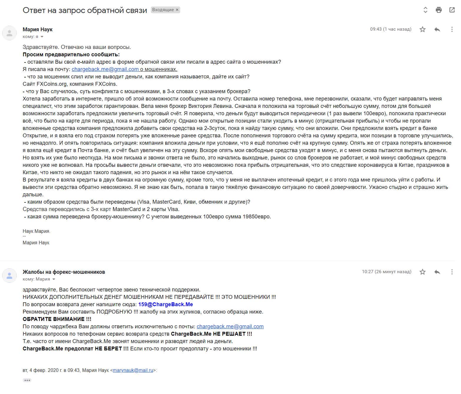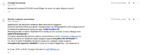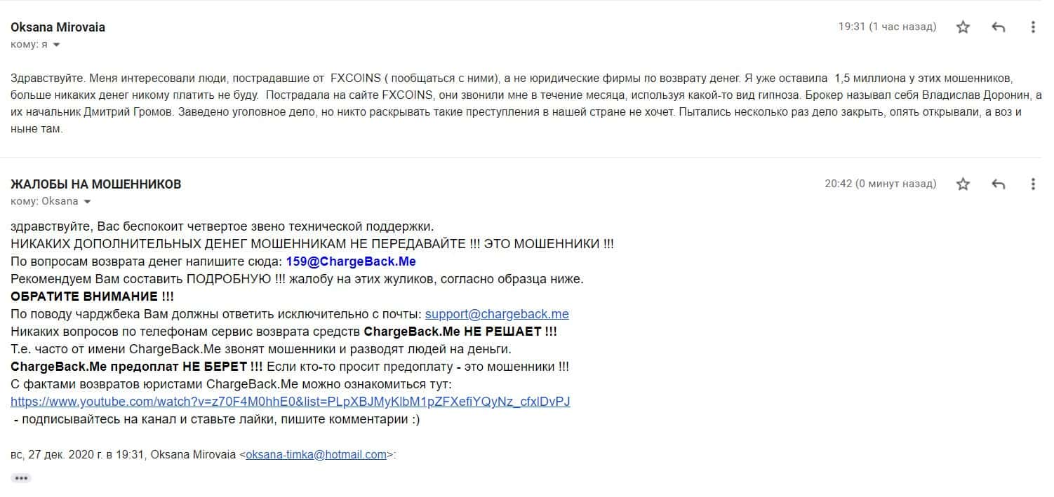 Следующим информационным материалом о ФХ Коинс также является жалоба от одного из пострадавших клиентов сего интернет-лохотрона. Теперь, чтобы вернуть утраченные деньги в этой конторе, человеку необходимо скорейшим образом связаться с сервисом ChargeBack.Me