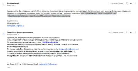 Одна потерпевшая рассказала нам вкратце о случае, где она попалась сразу в несколько форекс-лохотронов. Среди них были следующие кухни: ГБ Опционс, ПтБанк, СС Маркет, 770 капитал, ФХ Коинс. Мошенники отказываются отдавать деньги и теперь вся надежда на сервис по возврату средств ChargeBack.Me