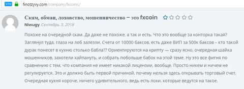 "FXCoins - мошенники чистой воды!!!" - так высказался один из людей, который вложил туда порядка 1000 долларов США. Когда он понял что это лохотрон и развод, то решил вывести деньги. Но ему не дали этого сделать. Когда он обратился в полицию, то там сказали, что кухня вне зоны досягаемости и как их прижать они понятия не имеют. Такие высказывания предупредят остальных потенциальных клиентов и они уже связываться с ДЦ ФХ Коинс не будут.