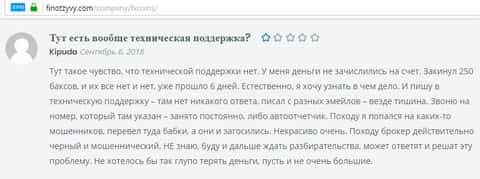 А вот следующий клиент форекс-конторки ФХ Коинс подметил по поводу ужасной работы технической поддержки. Человек вложил 250 долларов в контору, но деньги на счет так и не поступили. Когда он стал писать в техническую поддержку, то никто не отвечал, а номер телефона постоянно был на автоответчике или занят. Теперь нет ни денег, ни какой-либо информации по поводу его транзакции.