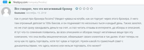 Вот очередной потенциальный клиент сомневается в том, стоит ли связываться с лохотронщиками FXCoins или же все-таки воздержаться. Дело в том, что он нашел канал в Ютубе, где какой-то тип показывает как он торгует на депозите в 100 000 долларов. Но все же есть сомнение, что это обычное завлекалово и тот чувак просто врет. Опасение человека подтвердились, когда он стал читать отзывы и стал очень благодарен не безразличным людям.