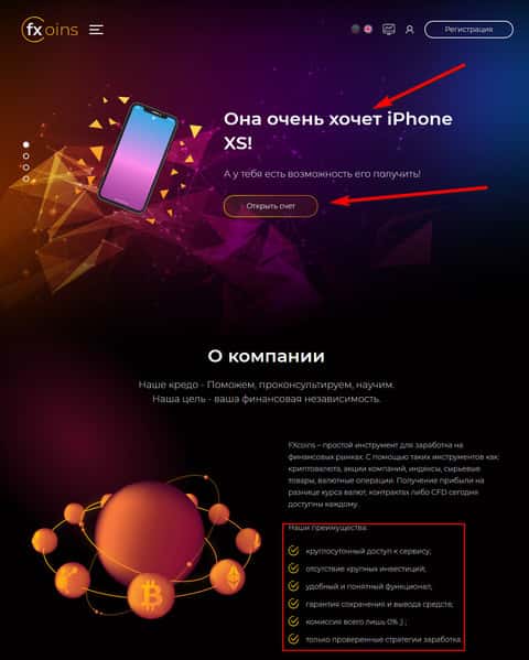Сайт конторы FXCoins выполнен в неплохом стиле, для того, чтобы расположить к себе новичка и чтобы он клюнул на красивую обложку. Но опытный глаз сразу же видит подвохи в виде завлекалова и различных уловках. Первое что бросается в глаза, так это акционные предложения, по типу "выиграй айфон" и сразу же предложена кнопка для открытия счета. Далее идут нереальные условия, которые аферисты предлагают своим наивным клиентам. Начиная от минимальных вложений и заканчивая проверенными стратегиями для заработка - обычно лохотроны подобного рода так и делают.