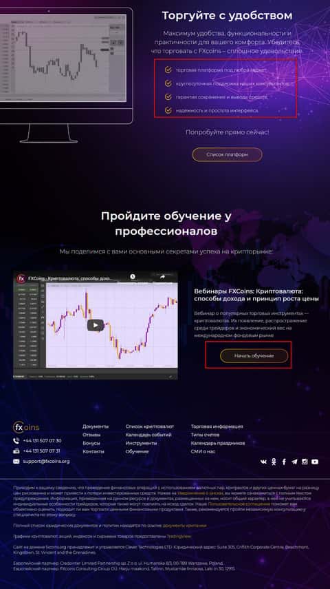 Следующее что попадается на глаза на сайте кухни FXCoins, так это то, что торговая платформа гарантирует сохранение и вывод средств, что очень вводит в заблуждение. Дело обычно доходит только до ввода денег, а потом жулики находят множество причин, чтобы ничего не отдавать. Далее идет привлечение новичков и предлагают пройти обучение и бесплатные вебинары. Там обычно занимаются промывкой мозгов и прочей ерундой, которая потом влияет на сознание людей и жертвы добровольно начинают нести жуликам из ФХ Коинс деньги.