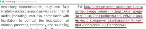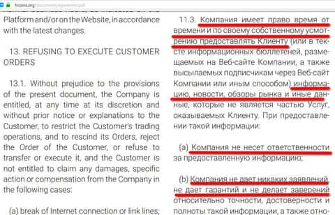 Чтобы понять, что за контора эта ФХ Коинс, следует обратиться к договору, который заключается между клиентом и самой компанией. Здесь четко видно, насколько кухня защищает интересы своего клиента. И вот уже в пятом разделе договора, нам удается найти такую вещь как ответственность за работу торговой платформы. Как оказалось, в случае, если клиент столкнется с проблемами в работе программы, то вся ответственность лежит на нем.
