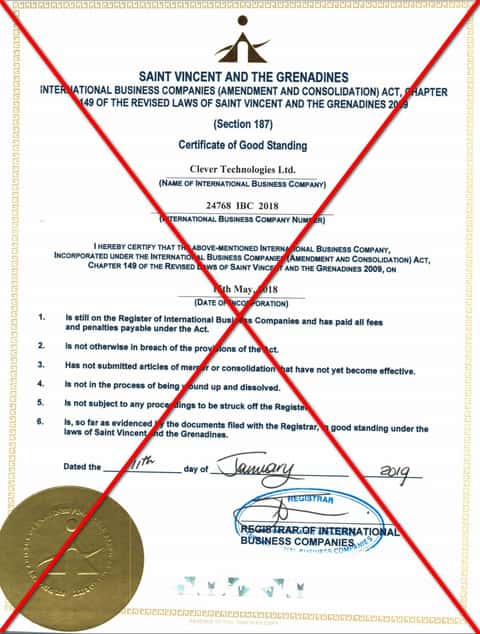 Аферисты брокерской кухни FXCoins забыли или перепутали такую важную информацию, как лицензия на проведение свое деятельности в любой из стран, где она работает. Когда мы начали копаться в этих данных, то узнали, что кухня FXCoins зарегистрирована в оффшоре Сент-Винсент и Гренадин под названием Clever Technologies LTD. При чем сертификат выдан 15 мая 2018 года, а контора позиционирует свое открытие еще пару лет назад. Одни не совпадения, да еще и контора Фх Коинс выставляет этот документ о регистрации как свою лицензию, хотя это далеко не так.
