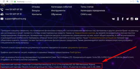 Несмотря на то, что контора ФХ Коинс зарегистрирована на островах Сент-Винсент и Гренадин, а офисы есть в Шотландии и России, так еще ко всему этому аферисты имеют несколько партнеров в Европе. А именно в Польше и Эстонии. Ниже представлены названия и адреса вышеупомянутых компаниях: