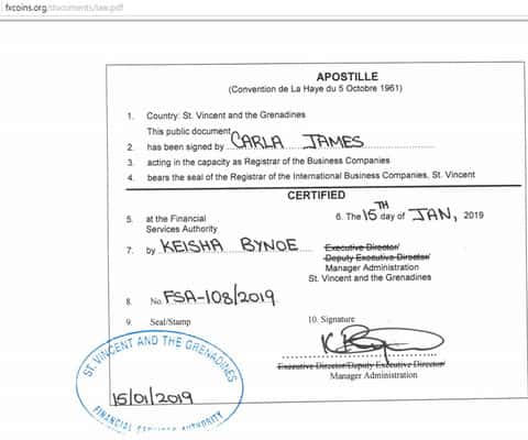 Так как прямой и доступной информации о руководстве дилинговой кухни ФХ Коинс здесь не нашлось, то пришлось копаться в их юридических документах. В копии апостиля, который выставлен на ряду с документом об основании компании, указано, что руководителем является некая Carla James. Подставное это лицо или реальный директор, нам неизвестно. Мы исходим только из той информации, которая есть в публичном доступе.