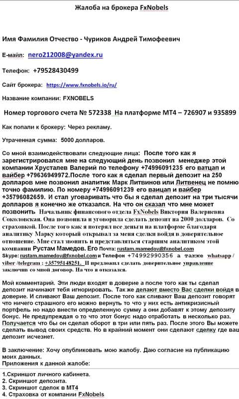 - Подробная жалоба на мошенников Фх Нобелс - клиент утратил примерно 4500 евро
