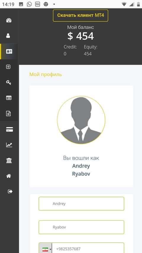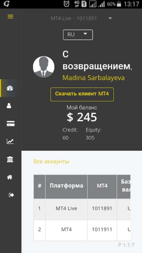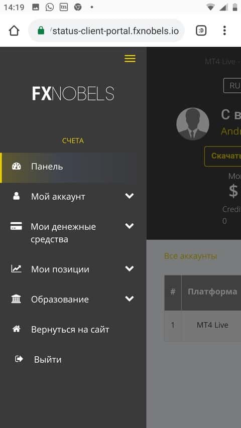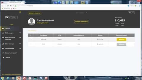 Так выглядит панель управления в личном кабинете опрокинутого клиента брокерской конторы ФХ Нобелс.