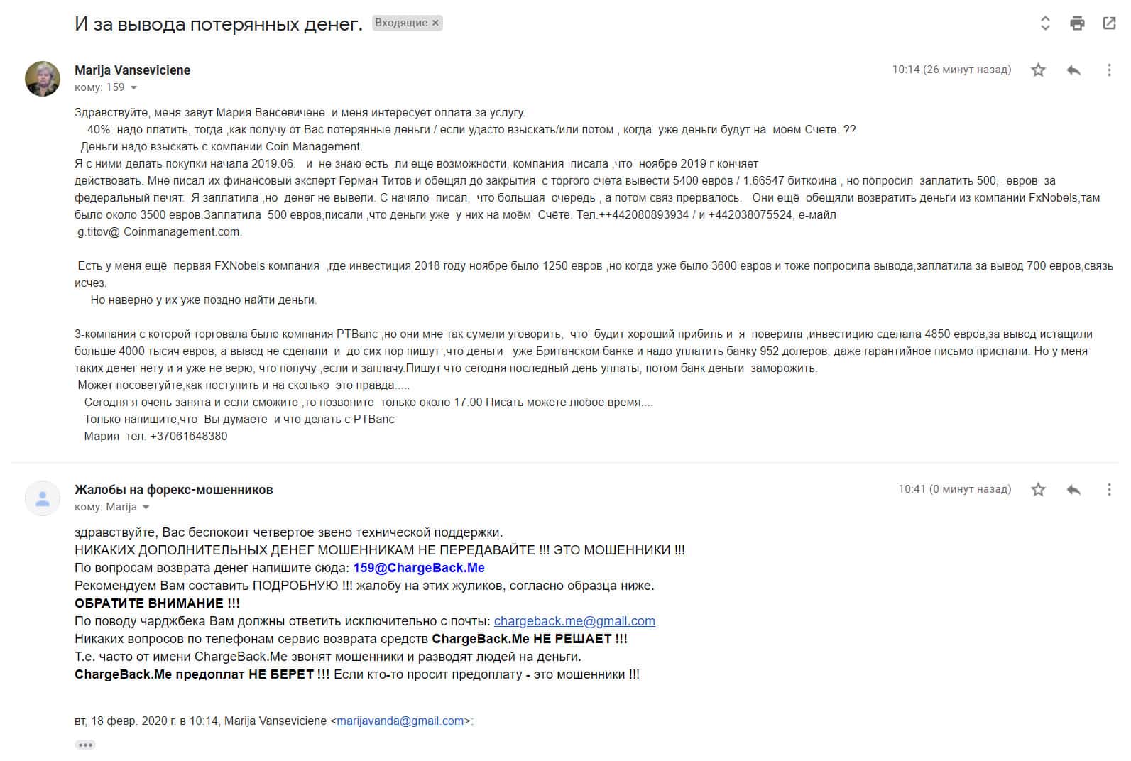 - Жалоба на ФХНобелс, ПтБанк и Коин Менеджментс - клиент потерял примерно 5000 евро