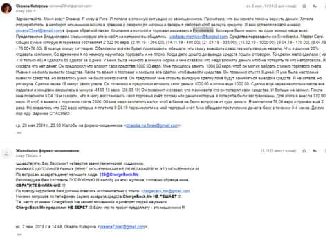 Здесь потерпевшая рассказала, как аферисты двух форекс-контор обворовали ее и отказывается возвращать деньги. В схемах замешана не только контора ФХ Нобелс, но и кухня FinTrustTrade. Сумма достаточно не маленькая и причины не возврата у обоих форекс-контор одинаковые. Чтобы их наказать и вернуть сворованное, она послала сообщение в организацию ChargeBack.Me где пообещали помочь.