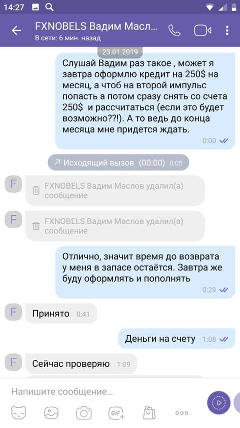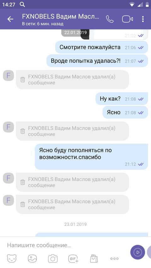 Со следующего скриншота мы видим, как жулик Вадим Маслов из форекс-конторы FXNobels, удалил ряд сообщений переписки с клиентом.