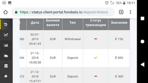 Одна женщина попалась на уловки форекс-аферистов и теперь не может вывести свои вложенные средства. Контора ФХ Нобелс и ее сотрудники смогли увести у клиентки 245 долларов и теперь не желают обрабатывать заявку на вывод по необъяснимым причинам. Сумма в принципе не большая, но терять ее тоже не хочется. Что же, надеемся наши партнеры смогут помочь вернуть украденное через услугу чарджбек.