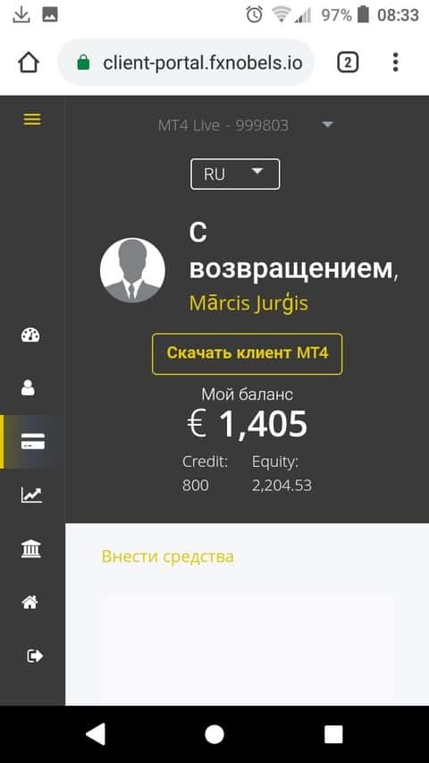 Следующий скриншот показывает, что жулики ФХ Нобелс не только не выводили деньги со счета, но и перестали принимать.
