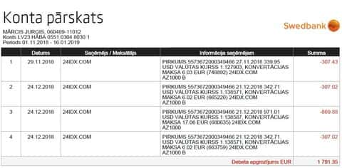 Ниже представлена выписка из банковского счета клиента банка Swedbank, на котором видно, что деньги были переведены на реквизиты конторы ФХ Нобелс.