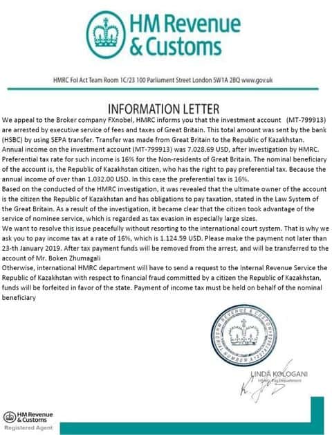А это соответственно и само письмо от регулятора HM Revenue&Customs, которое в фотошопе нарисовали аферисты брокерской кухни ФХ Нобелс, дабы выманить у клиента еще одну тысячу долларов.