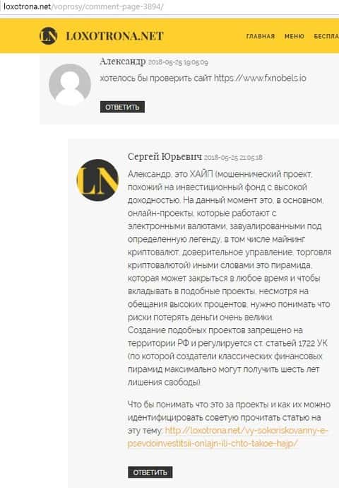 На одном из сайтов, который посвящен интернет-лохотронам, в комментариях к статье один человек поинтересовался о форекс-кухне FXNobels. Администрация сайта уверенно высказалась о том, что это контора обычный хайп похожий на инвестиционный фонд с высокой доходностью, задачей которого является заманить и вытащить все деньги у клиента!