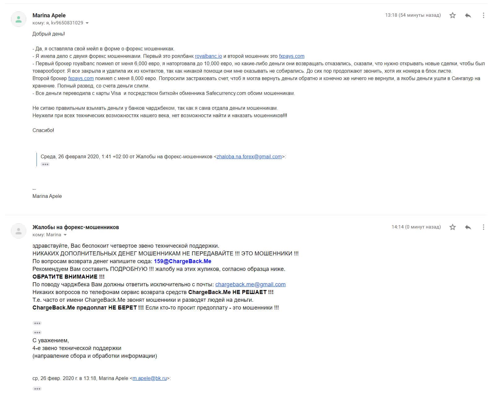 Далее представлена жалоба от клиентки, которая попалась сразу же в две форекс-конторы, а именно ФХ Пайс и Роял Банк. Сначала был Роял Банк поимел с нее около 6000 евро, а потом черный брокер FXPays взял остальную часть в размере 8000 евро. Просили застраховать счет, но это конечно тупой развод для лохов.